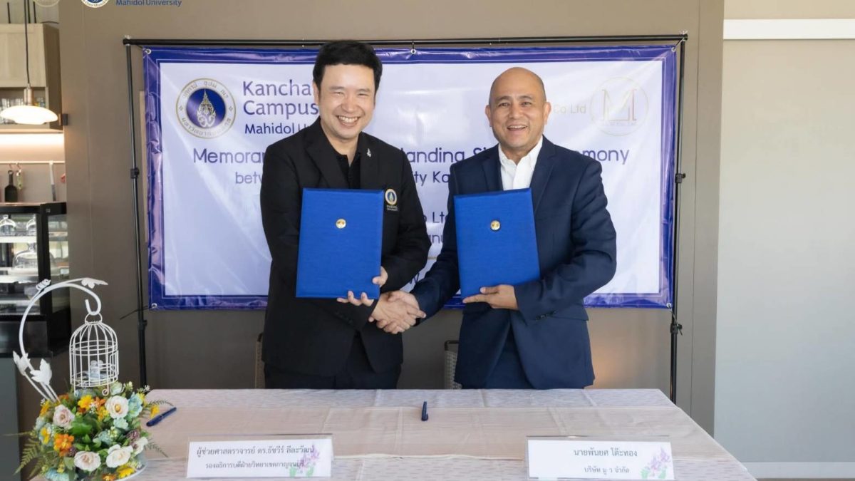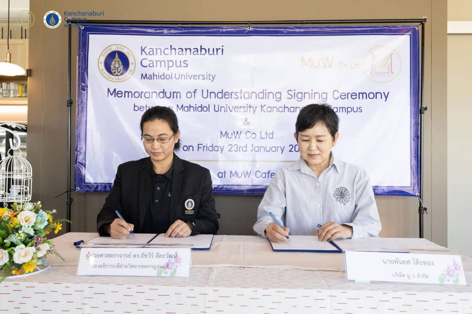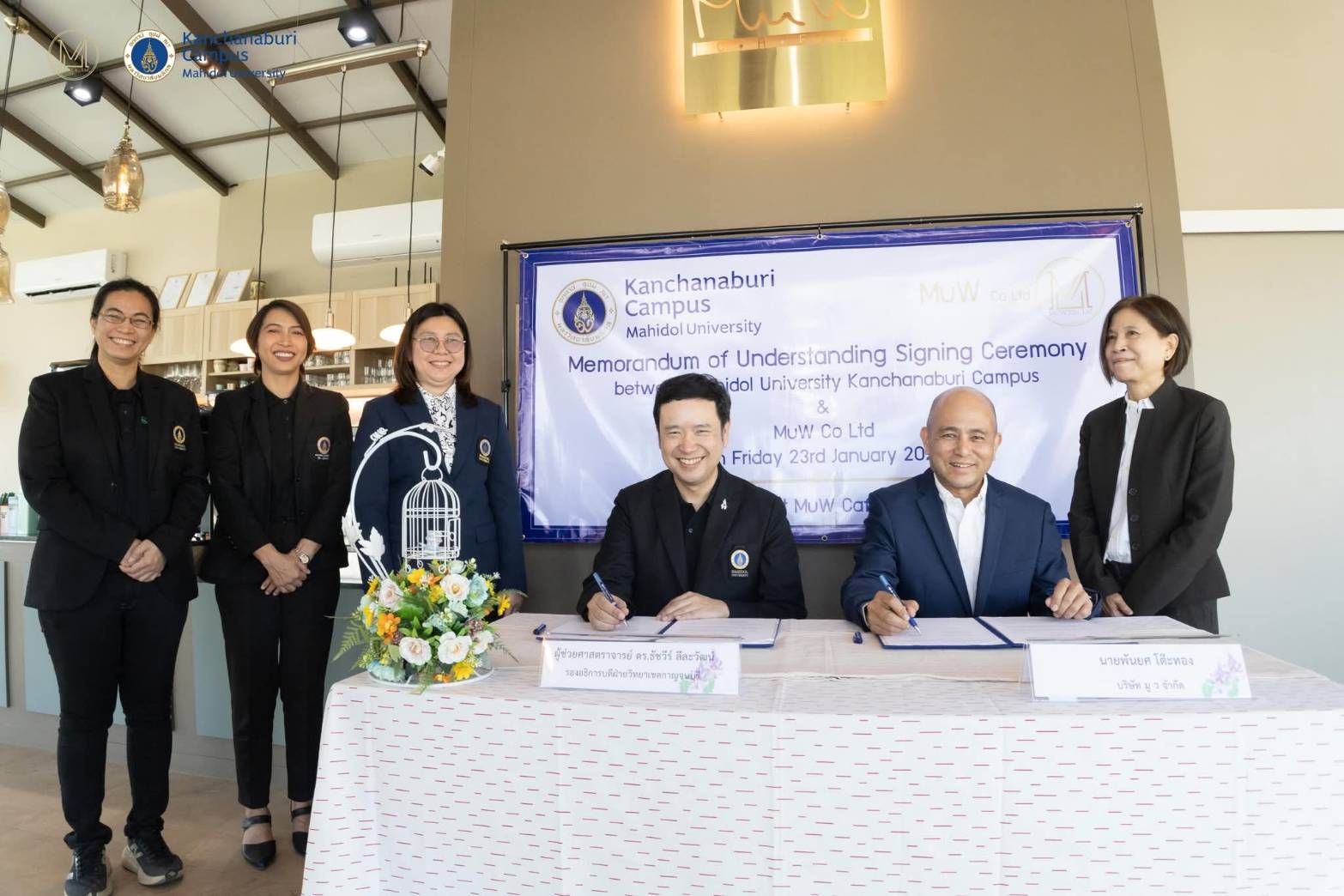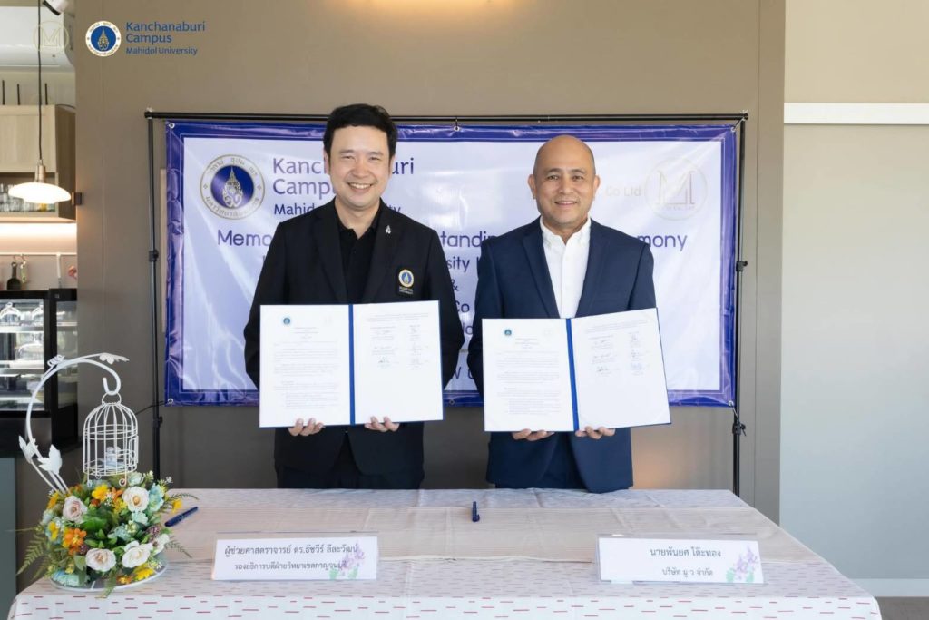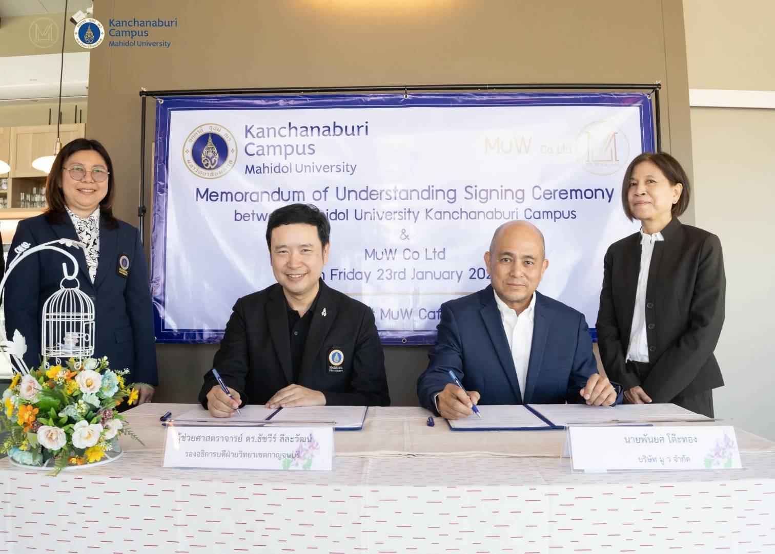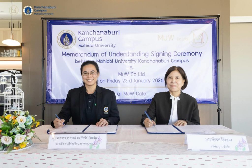 วันที่ 23 มกราคม 2569 ผู้ช่วยศาสตราจารย์ ดร.ธัชวีร์ ลีละวัฒน์ รองอธิการบดีฝ่ายวิทยาเขตกาญจนบุรี มหาวิทยาลัยมหิดล พร้อมด้วย นายพันยศ โต๊ะทอง ประธานบริษัท บริษัท มู ว จำกัด ร่วมลงนามบันทึกข้อตกลงความร่วมมือ (Memorandum of Understanding: MOU) ด้านวิชาการ การวิจัย การพัฒนานวัตกรรม และการพัฒนาทรัพยากรมนุษย์ ตลอดจนการขับเคลื่อนกิจกรรมที่ก่อให้เกิดประโยชน์ต่อสังคม ชุมชน และการพัฒนาที่ยั่งยืนร่วมกัน