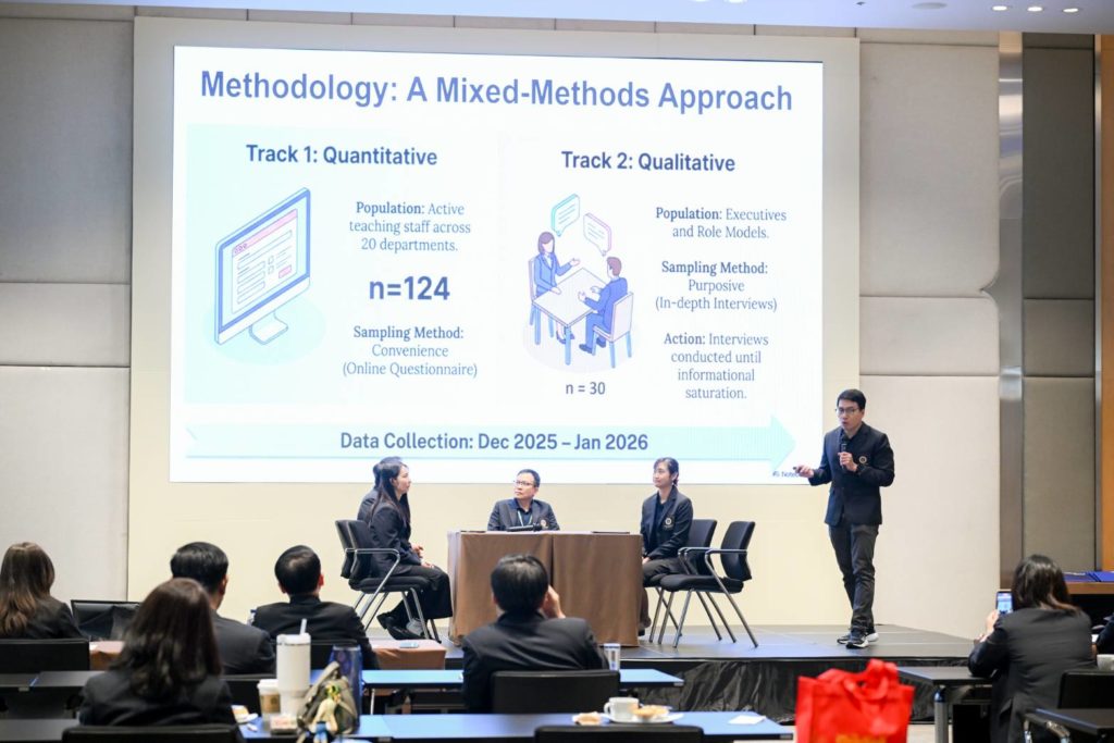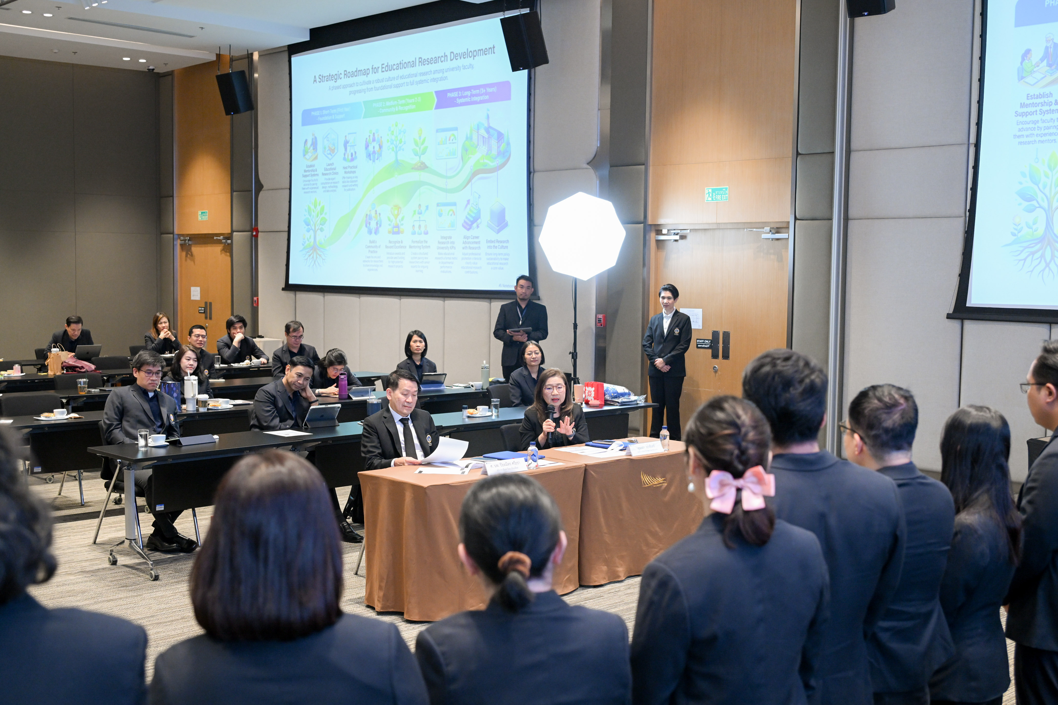 ภายในงานมีการนำเสนอสารนิพนธ์ ประกอบด้วย กลุ่มที่ 1 หัวข้อ “ช่องว่างของงานวิจัยด้านการศึกษา : ปัญหา ข้อจำกัด และทางออกสู่การนำไป ใช้จริง” กลุ่มที่ 2 หัวข้อ “OMOT สานพลังมหิดลเพื่อสังคมสุขภาวะศาลายา” กลุ่มที่ 3 หัวข้อ “การพัฒนาการตระหนักรู้ในตนเองตามกรอบ IDGs ผ่านระบบติดตามอารมณ์ดิจิทัล : การวิจัยแบบผสมผสาน” และกลุ่มที่ 4 หัวข้อ “International Accredition จะไปต่อให้สุด ? หรือ หยุดให้รู้เรื่อง” โอกาสนี้ ศาสตราจารย์ นายแพทย์ปิยะมิตร ศรีธรา อธิการบดีมหาวิทยาลัยมหิดล คุณนรา เปาอินทร์ รองอธิการบดีฝ่ายบริหารบุคลากรและพัฒนาองค์กร อาจารย์ ดร.เจษฎา อานิล ผู้ช่วยอธิการบดีฝ่ายการศึกษา มหาวิทยาลัยมหิดล และอาจารย์ ดร.เลิศยศ ตรีรัตนไพบูลย์ ผู้ช่วยอธิการบดีฝ่ายพัฒนาคุณภาพ มหาวิทยาลัยมหิดล เข้าร่วมรับฟังการนำเสนอสารนิพนธ์ ภายหลังการนำเสนอได้มีข้อเสนอแนะ และความคิดเห็น เพื่อนำไปปรับปรุงและจัดทำเป็นรายงานผลการศึกษาฉบับสมบูรณ์ต่อไป