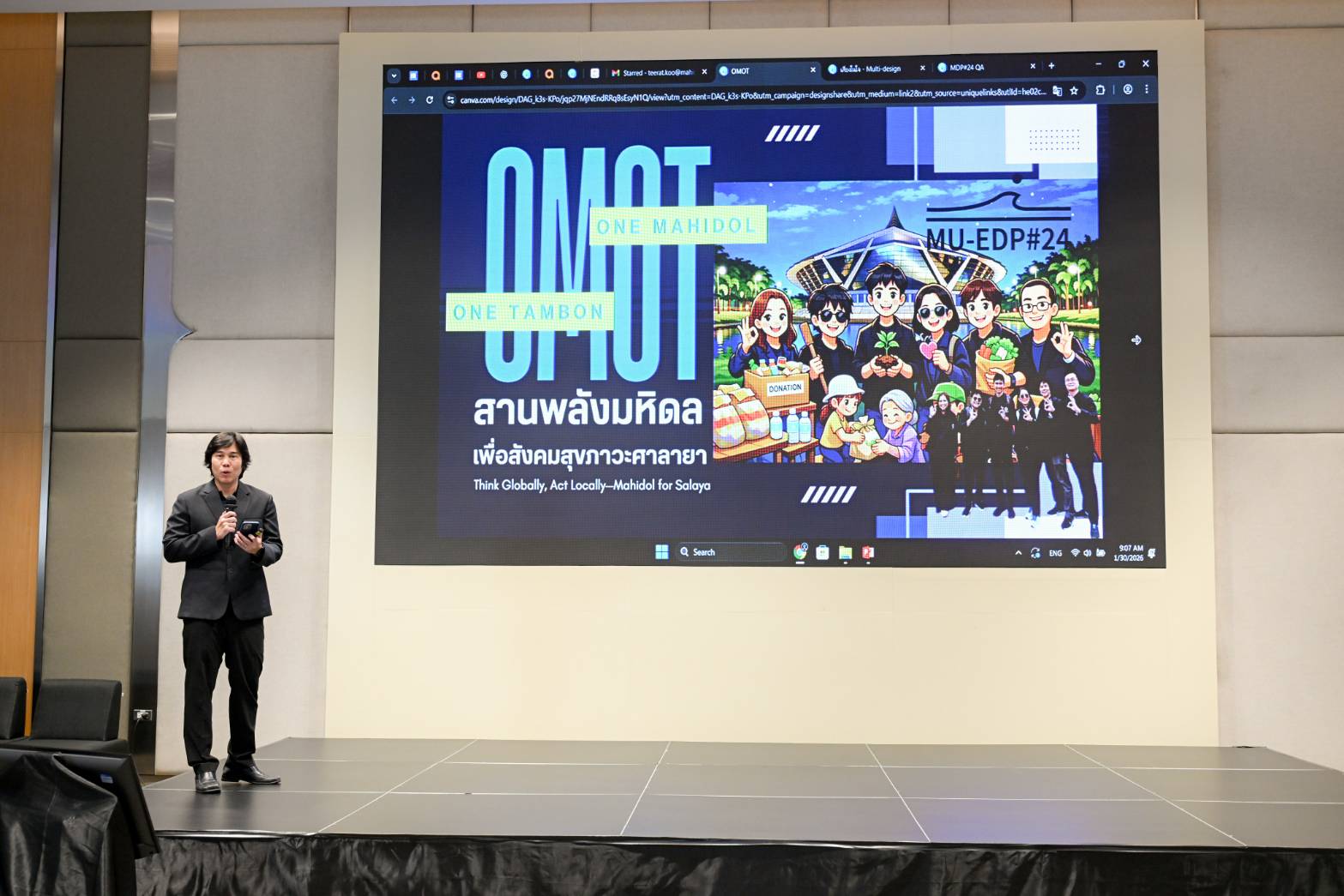 โครงการ MU-EDP#24 จัดโดย กองทรัพยากรบุคคล มหาวิทยาลัยมหิดล ระหว่างวันที่ 26 พฤศจิกายน 2568 – 30 มกราคม 2569 เพื่อให้ผู้บริหารระดับกลางของมหาวิทยาลัยมหิดลมีสมรรถนะและองค์ความรู้ที่หลากหลาย เสริมทักษะที่จำเป็นต่อการบริหารจัดการสมัยใหม่ สอดคล้องกับสถานการณ์การเปลี่ยนแปลงในปัจจุบัน มีความรู้การบริหารงานที่เข้มแข็งตามหลักธรรมภิบาลอย่างเป็นระบบ และสามารถจัดทำถ่ายทอดแผนยุทธศาสตร์เพื่อร่วมขับเคลื่อนส่งเสริมภารกิจของมหาวิทยาลัย อีกทั้ง เป็นการแลกเปลี่ยนเรียนรู้ความคิดเห็นและประสบการณ์เพื่อส่งเสริมการทำงานระหว่างส่วนงานและเครือข่ายทางการบริหารที่ดีต่อไปในอนาคต