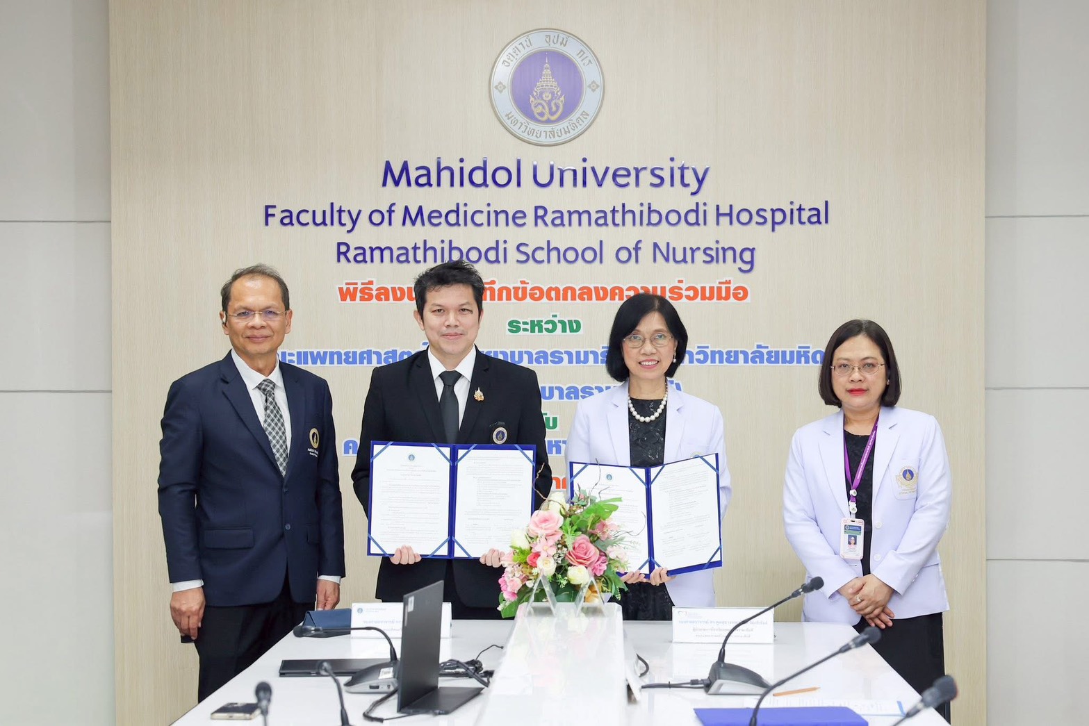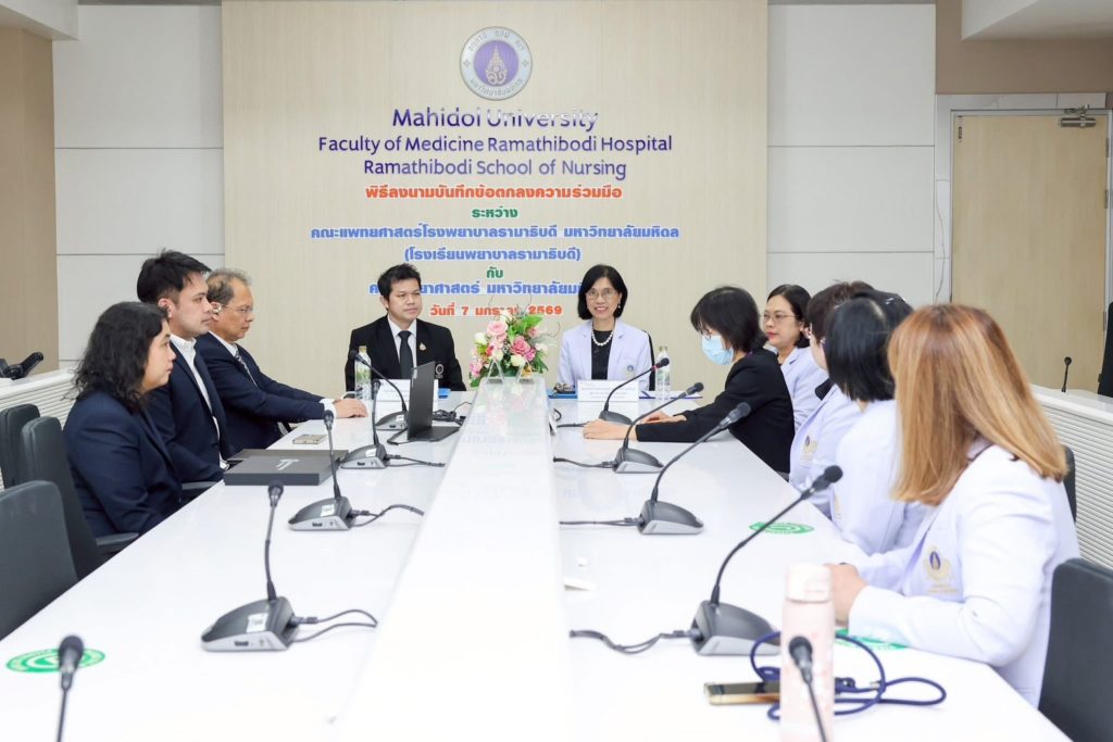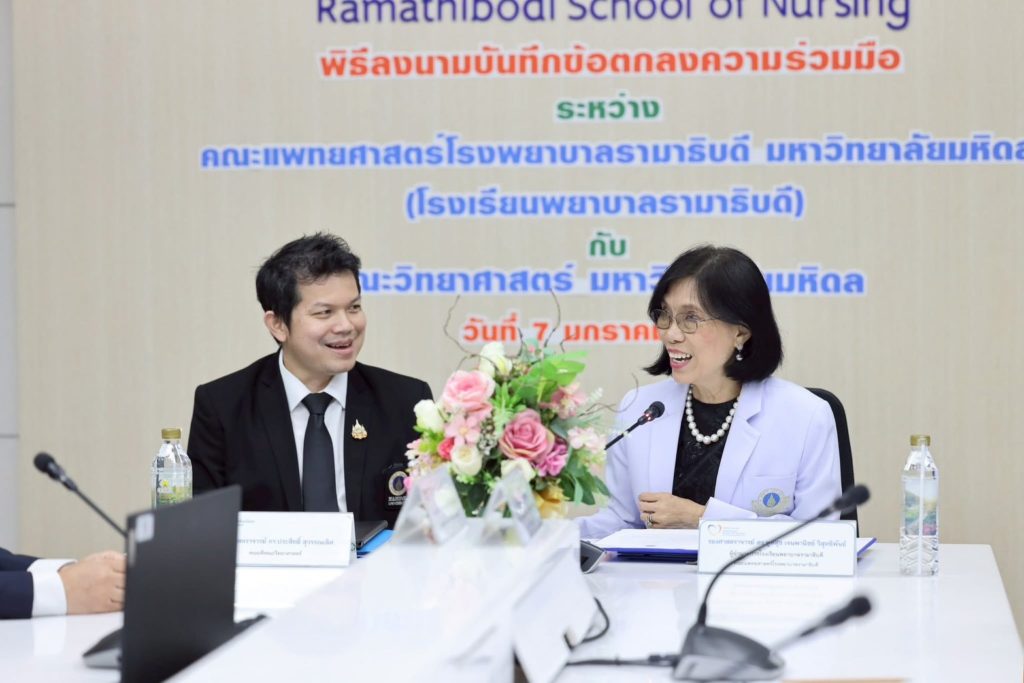 วันที่ 7 มกราคม 2569 รองศาสตราจารย์ ดร.พูลสุข เจนพานิชย์ วิสุทธิพันธ์ ผู้อำนวยการโรงเรียนพยาบาลรามาธิบดี คณะแพทยศาสตร์โรงพยาบาลรามาธิบดี มหาวิทยาลัยมหิดล พร้อมด้วย รองศาสตราจารย์ ดร.ประสิทธิ์ สุวรรณเลิศ คณบดีคณะวิทยาศาสตร์ มหาวิทยาลัยมหิดล ลงนามบันทึกข้อตกลงความร่วมมือทางวิชาการ (MOU) ระหว่าง โรงเรียนพยาบาลรามาธิบดี คณะแพทยศาสตร์โรงพยาบาลรามาธิบดี มหาวิทยาลัยมหิดล กับ คณะวิทยาศาสตร์ มหาวิทยาลัยมหิดล ซึ่งมีผู้บริหารทั้งสองฝ่าย ร่วมเป็นสักขีพยาน ณ ห้อง 418 ชั้น 4 อาคารเรียนและปฏิบัติการรวมด้านการแพทย์และโรงเรียนพยาบาลรามาธิบดี คณะแพทยศาสตร์โรงพยาบาลรามาธิบดี มหาวิทยาลัยมหิดล