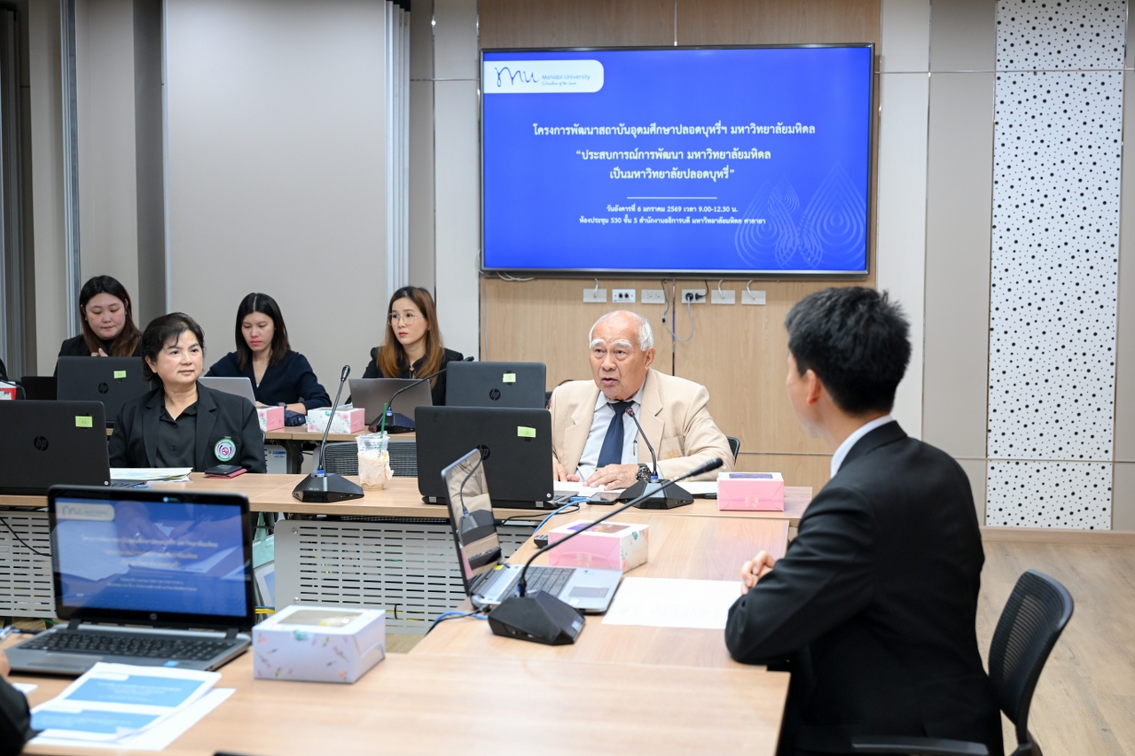 วันที่ 6 มกราคม 2569 ผู้ช่วยศาสตราจารย์ ดร.อิทธิโชติ จักรไพวงศ์ รองอธิการบดีฝ่ายกายภาพและสิ่งแวดล้อม มหาวิทยาลัยมหิดล เป็นประธานกล่าวต้อนรับคณะกรรมการพิจารณาผลงานสถาบันอุดมศึกษาปลอดบุหรี่ดีเด่น ปี 2567-2569 นำโดย นายแพทย์วันชาติ ศุภจัตุรัส รองประธานโครงการพัฒนาสถาบันอุดมศึกษาปลอดบุหรี่ บุหรี่ไฟฟ้าฯ พร้อมด้วยคณะกรรมการพิจารณาผลงานสถาบันอุดมศึกษาปลอดบุหรี่ดีเด่น ในโอกาสเข้าเยี่ยมชมและรับฟังข้อมูลการดำเนินงานขับเคลื่อนโครงการสถาบันอุดมศึกษาปลอดบุหรี่ของมหาวิทยาลัยมหิดล เพื่อรับการประเมินผลงานสถาบันอุดมศึกษาปลอดบุหรี่ดีเด่น ปี 2567-2569 พร้อมแลกเปลี่ยนประสบการณ์การทำงานร่วมกับคณะกรรมการดำเนินงานพัฒนามหาวิทยาลัยมหิดลเป็นมหาวิทยาลัยปลอดบุหรี่ ในการพัฒนามหาวิทยาลัยมหิดลเพื่อเป็นต้นแบบมหาวิทยาลัยปลอดบุหรี่ให้แก่สถาบันอุดมศึกษาในเครือข่ายทั่วประเทศ ณ ห้อง 530 สำนักงานอธิการบดี มหาวิทยาลัยมหิดล ศาลายา