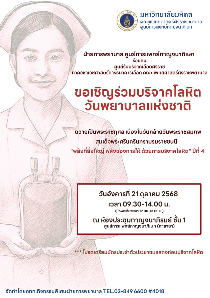 ศูนย์การแพทย์กาญจนาภิเษก ขอเชิญผู้สนใจร่วมบริจาคโลหิต กับศูนย์รับบริจาคเลือดศิริราช ภาควิชาเวชศาสตร์การธนาคารเลือด คณะแพทยศาสตร์ศิริราชพยาบาล