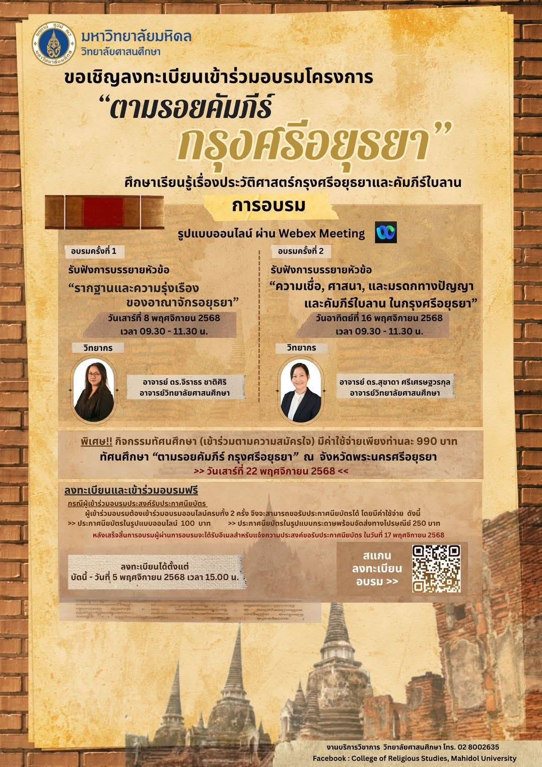 ขอเชิญเข้าร่วมอบรมโครงการ “ตามรอยคัมภีร์ กรุงศรีอยุธยา”