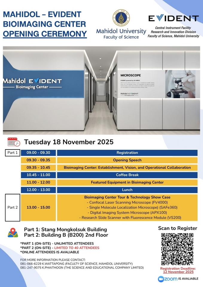 📣 หน่วยเครื่องมือกลาง (CIF) งานวิจัยและนวัตกรรม คณะวิทยาศาสตร์ มหาวิทยาลัยมหิดล ร่วมกับ บริษัท เดอะ ไซเอนซ์ แอนด์ เอ็ดดูเคชั่นแนล จำกัด และ บริษัท Evident Scientific Singapore Pte. Ltd.