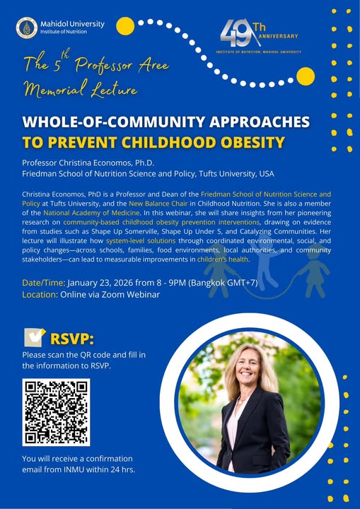 ในปีนี้ ได้รับเกียรติจาก Professor Christina Economos, Ph.D. (Dean of Friedman School of Nutrition Science and Policy, Tufts University, USA) บรรยายเรื่อง “Whole-of-community Approaches to Prevent Childhood Obesity”