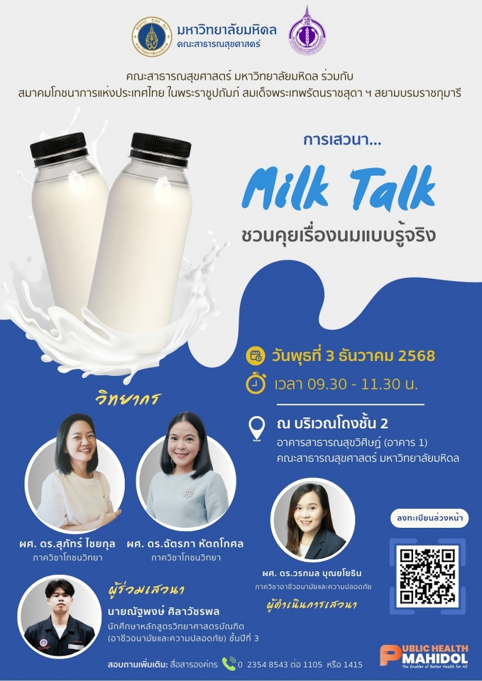 คณะสาธารณสุขศาสตร์ มหาวิทยาลัยมหิดล ขอเชิญชวนทุกท่านร่วมงานเสวนา “Milk Talk: ชวนคุยเรื่องนมแบบรู้จริง”