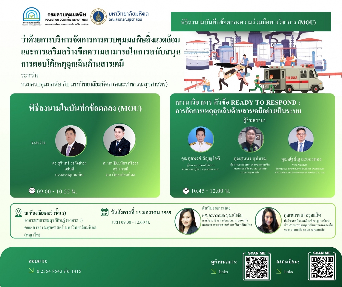 “พิธีลงนามบันทึกข้อตกลงความร่วมมือทางวิชาการระหว่างมหาวิทยาลัยมหิดล (คณะสาธารณสุขศาสตร์) กับ กรมควบคุมมลพิษ”