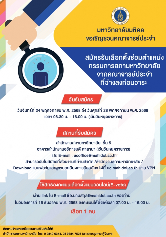 มหาวิทยาลัยมหิดลขอเชิญชวนคณาจารย์ประจำ สมัครรับเลือกตั้งซ่อมตำแหน่งกรรมการสภามหาวิทยาลัยจากคณาจารย์ประจำ ที่ว่างลงก่อนวาระ